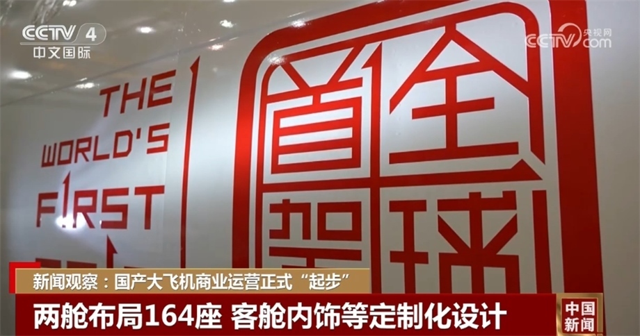 今天執(zhí)行商業(yè)首飛的C919飛機(jī)為164座兩艙布局,公務(wù)艙8座,經(jīng)濟(jì)艙156座??团搩?nèi)飾、旅客座椅、機(jī)載娛樂系統(tǒng)和飛機(jī)外部涂裝做了定制化設(shè)計(jì)。機(jī)身前部印有“全球首架”的“中國(guó)印”標(biāo)識(shí)和對(duì)應(yīng)英文。飛機(jī)注冊(cè)號(hào)B-919A,“B”代表飛機(jī)的中國(guó)國(guó)籍,“919”和型號(hào)名稱契合,“A”則有首架之意,突顯這一全球新機(jī)型、全球首架的非凡意義。