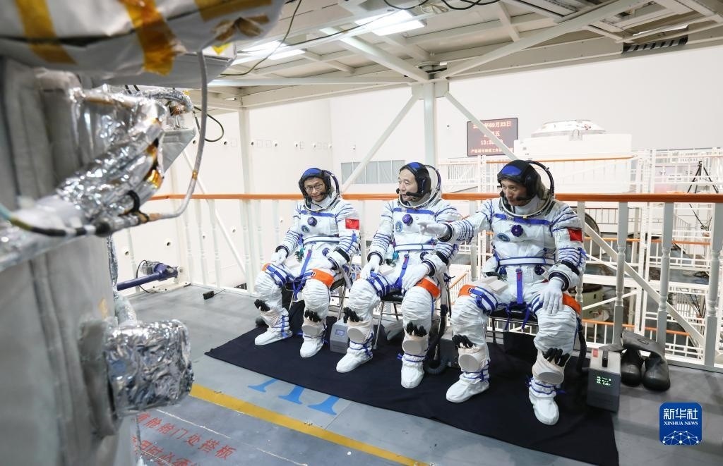 神舟十六號航天員乘組在飛船模擬器中(2023年5月8日攝)。新華社發(fā)(徐部 攝)
