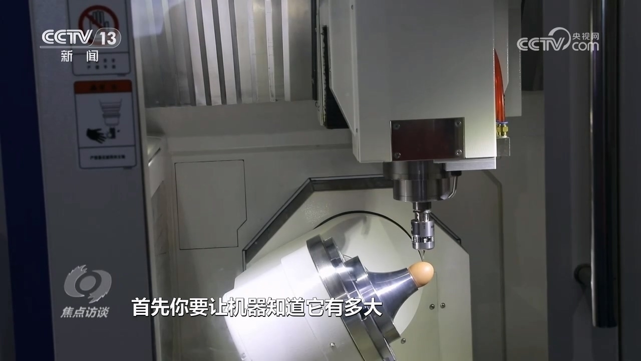 北京中關(guān)村精雕智造科技創(chuàng)新中心副總經(jīng)理楊錳:“一個是識別,給機床安上了一雙眼睛,能知道雞蛋長什么樣子;另外一個就是要求機床精度和穩(wěn)定性非常高,保證雞蛋永遠刻不爛、刻不破?!?/p>
