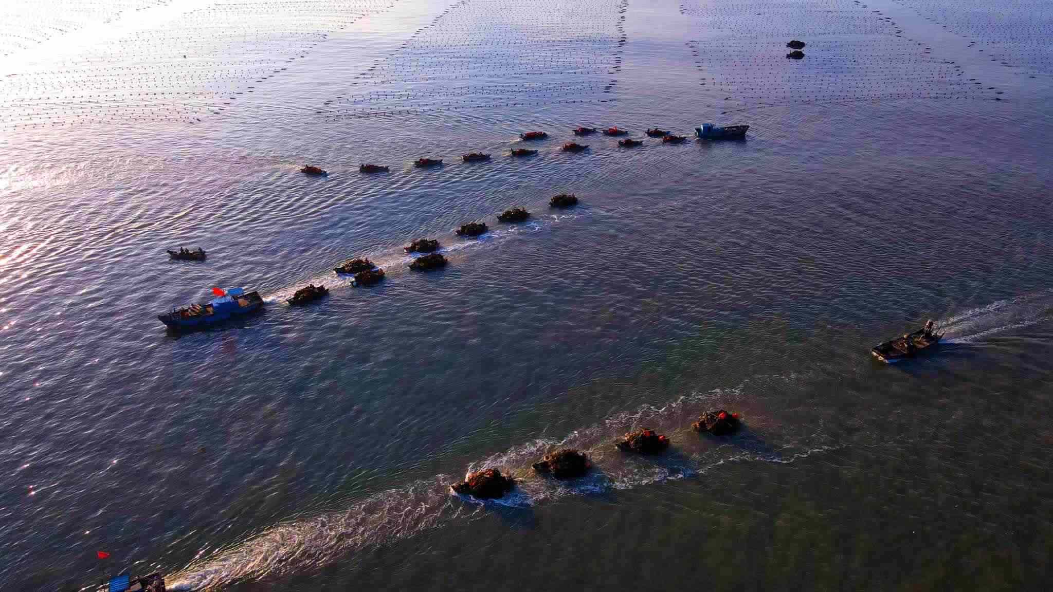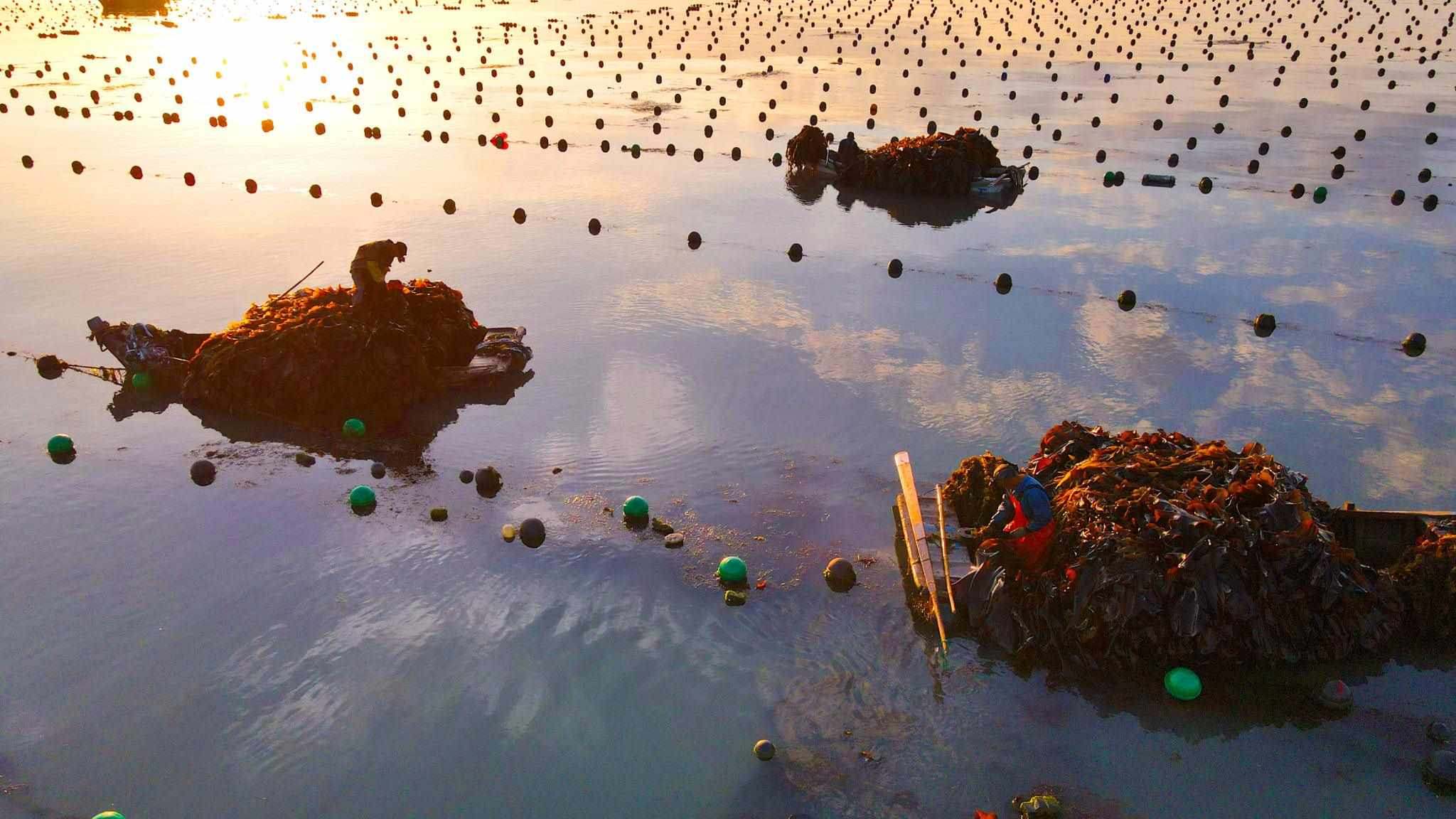 2023年5月31日,山東威海,榮成愛倫灣海洋牧場,漁民駕駛船只在海上收獲海帶,美麗的朝霞倒影在海上,海鷗伴舞,海洋牧場到處呈現(xiàn)一派豐收的喜人景象。視覺中國