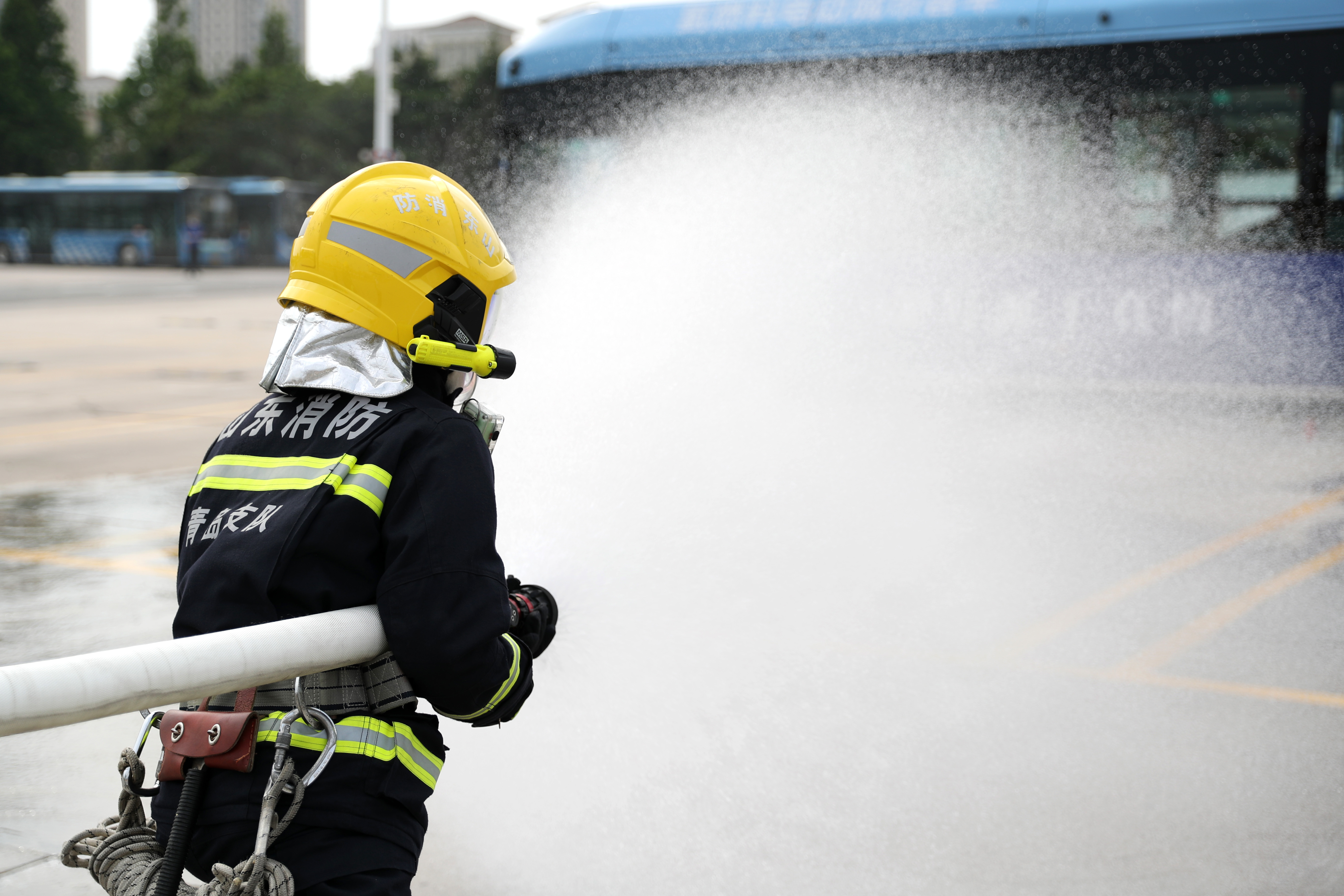 5月30日,山東青島,消防官兵在進行公交車氫氣管路受損泄漏應急處置演練。