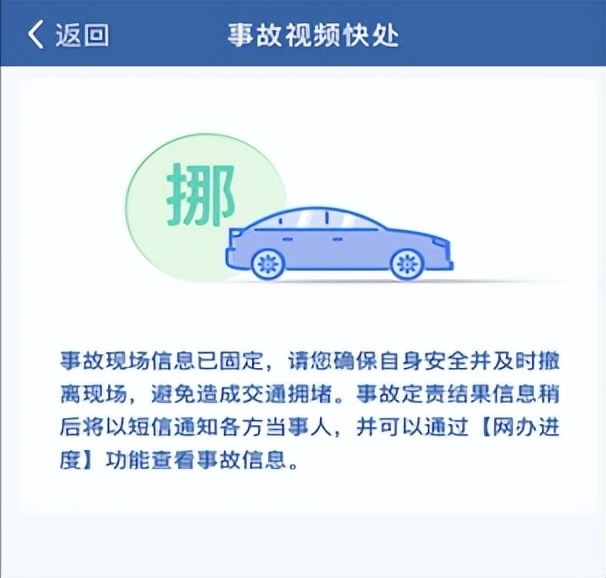 接警人員完成證據(jù)固定和信息采集后,"交管12123"APP將推送撤離事故現(xiàn)場提示信息,當(dāng)事人應(yīng)當(dāng)及時(shí)撤離,避免交通擁堵。
