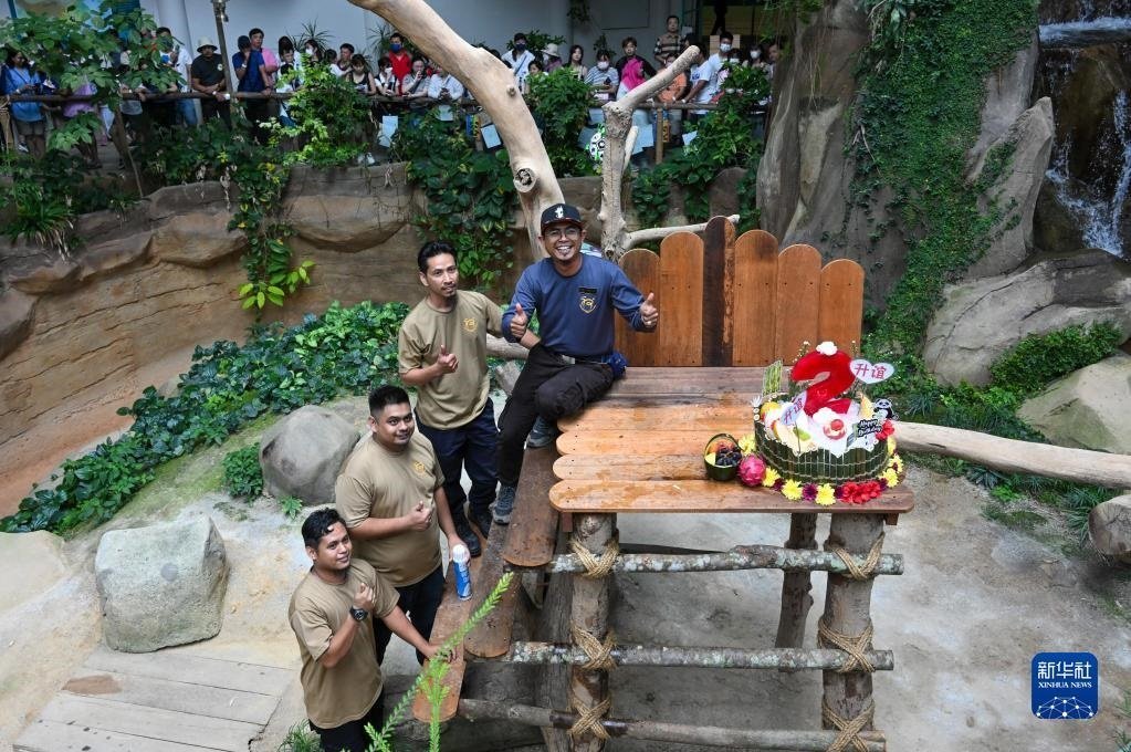 5月31日,在馬來西亞吉隆坡附近的馬來西亞國家動物園,大熊貓飼養(yǎng)員阿克邁勒(右)和他的團隊與“升誼”的生日蛋糕合影。