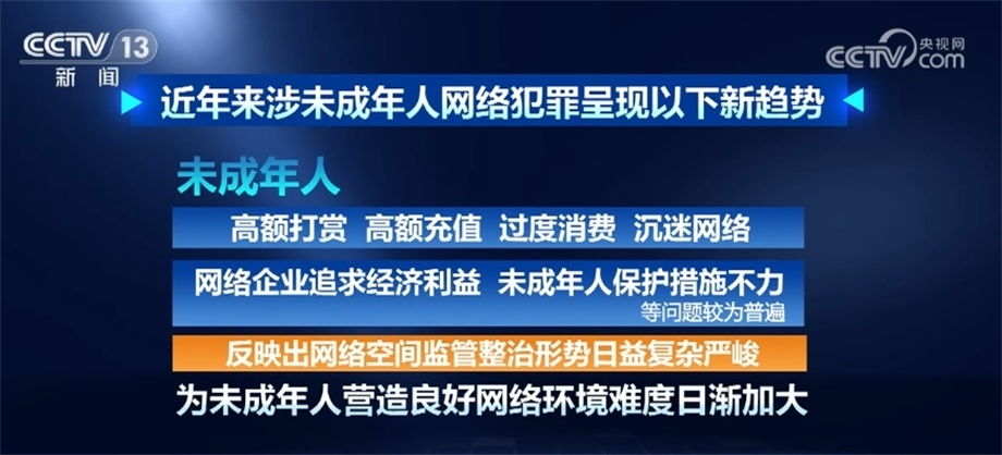 據(jù)最高檢相關(guān)部門負責人介紹,近年來涉未成年人網(wǎng)絡(luò)犯罪呈現(xiàn)以下新趨勢:未成年人觸網(wǎng)低齡化日趨明顯,更易遭受網(wǎng)絡(luò)不法侵害;利用網(wǎng)絡(luò)侵害未成年人犯罪手段復(fù)雜多樣,方式不斷翻新,“網(wǎng)絡(luò)誘騙”“隔空猥褻”等新類型犯罪隱蔽性強、打擊難度大;一些未成年人通過網(wǎng)絡(luò)接觸暴力、色情、毒品、低俗等不良信息,導致形成不健康價值觀,甚至盲目跟風、走向違法犯罪;未成年人高額打賞、高額充值、過度消費、沉迷網(wǎng)絡(luò),網(wǎng)絡(luò)企業(yè)追求經(jīng)濟利益、未成年人保護措施不力等問題較為普遍,反映出網(wǎng)絡(luò)空間監(jiān)管整治形勢日益復(fù)雜嚴峻,為未成年人營造良好網(wǎng)絡(luò)環(huán)境難度日漸加大。