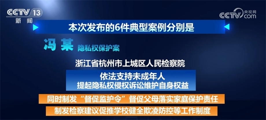 馮某隱私權(quán)保護案。針對未成年人隱私視頻被轉(zhuǎn)發(fā),生活學習受到影響,浙江省杭州市上城區(qū)人民檢察院依法支持未成年人提起隱私權(quán)侵權(quán)訴訟維護自身權(quán)益。同時,制發(fā)“督促監(jiān)護令”督促父母落實家庭保護責任,制發(fā)檢察建議促推學校健全欺凌防控等工作制度。