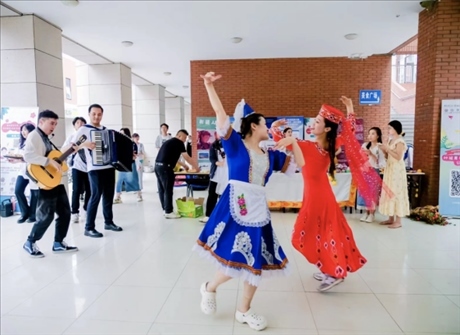 5月31日,“石榴籽 祖國行”新疆大學(xué)代表團(tuán)來到南開大學(xué)。在故事分享會上,王彥臣、李姝洋、迪力亞爾·迪力夏提同學(xué)向南開大學(xué)青年學(xué)子講述了“斷臂男孩”阿卜杜外力·阿卜杜拉、“黨徽大叔”阿布都加帕爾·猛德和“時代楷?!崩R尼·巴依卡的故事。在文藝大舞臺上,新疆大學(xué)代表團(tuán)各民族同學(xué)通過展示新疆特色舞蹈“木卡姆”、民族器樂“庫布孜”,向南開大學(xué)師生展現(xiàn)大美新疆熱情好客、能歌善舞的地域特色。
