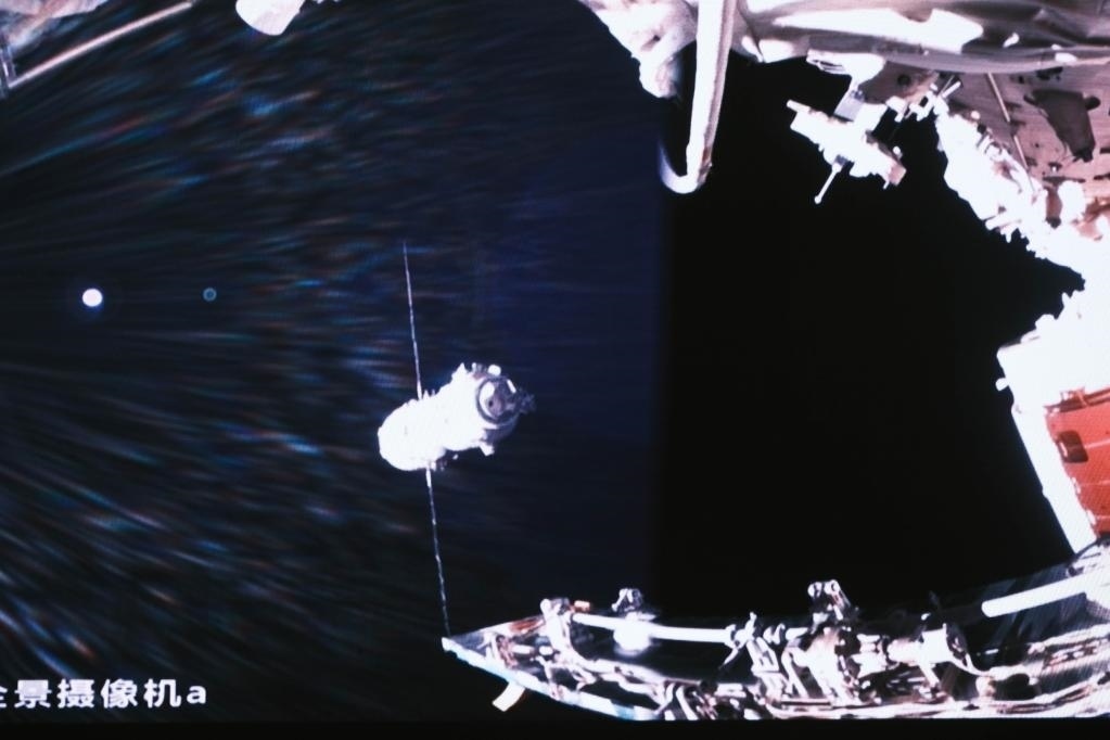 5月30日在北京航天飛行控制中心拍攝的神舟十六號(hào)載人飛船成功對(duì)接于空間站天和核心艙徑向端口的畫(huà)面。新華社記者 李杰 攝