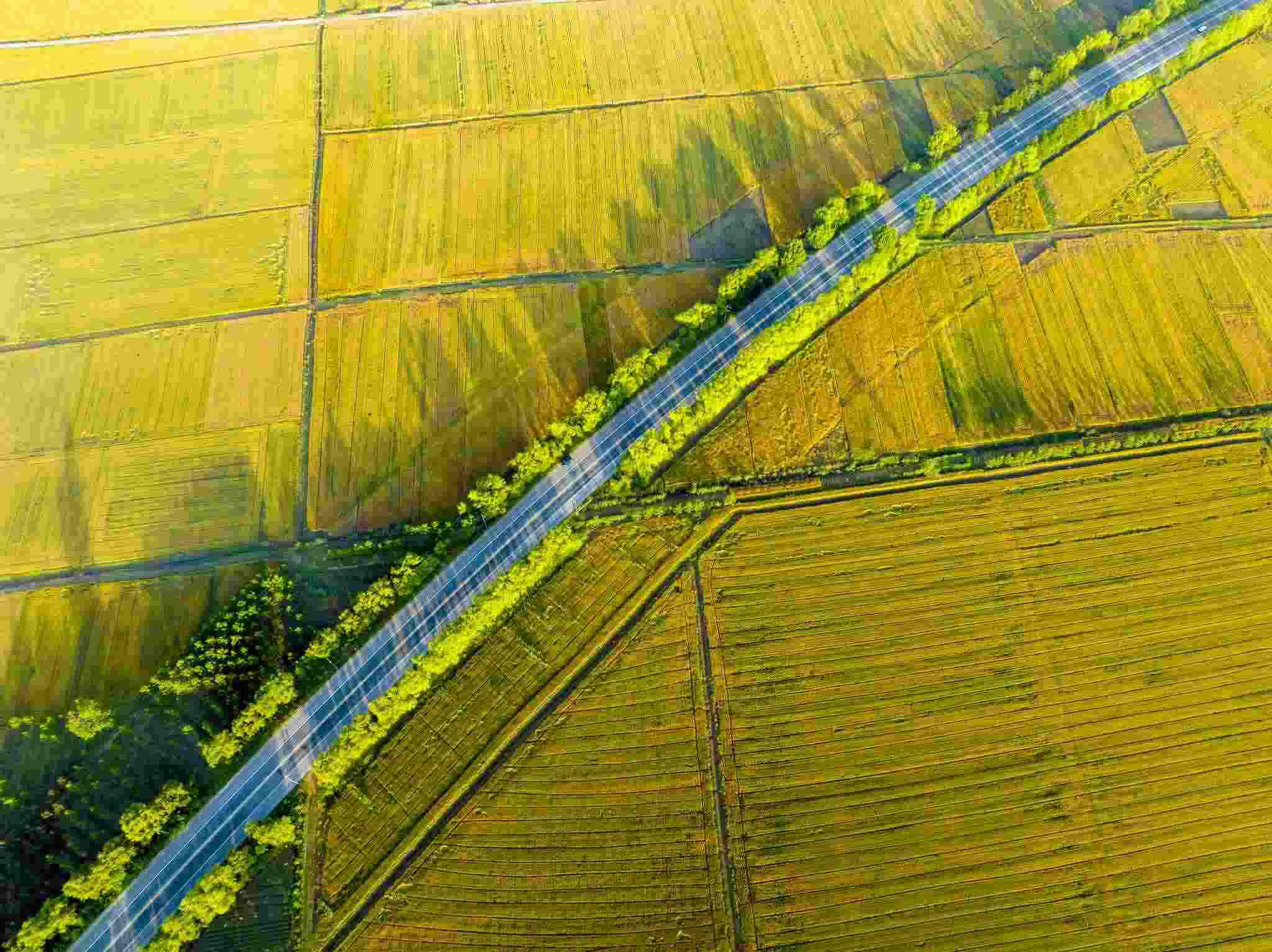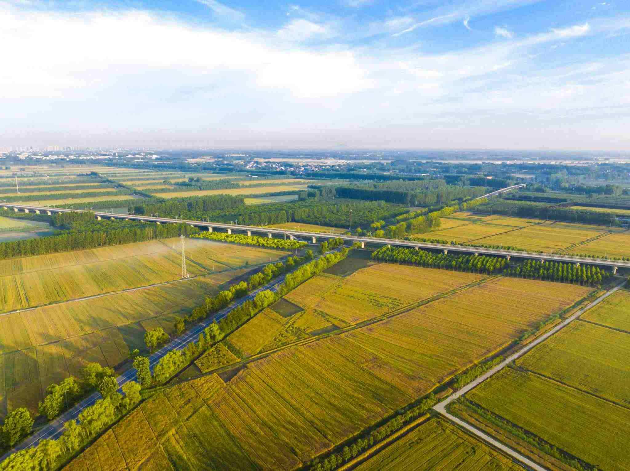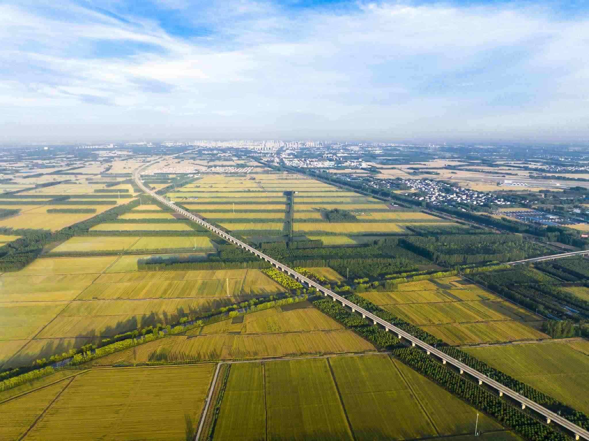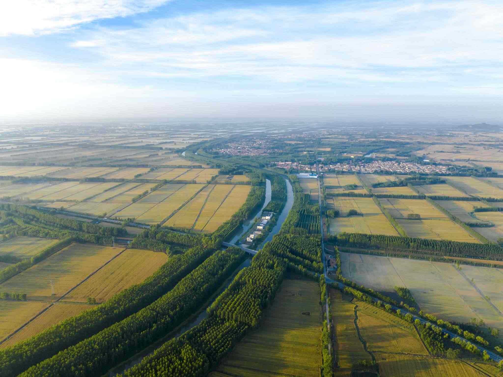 2023年6月3日,江蘇連云港,東??h,金色田野與村莊、道路、河流共同構(gòu)成了一幅秀美的夏日豐收畫卷。視覺(jué)中國(guó)