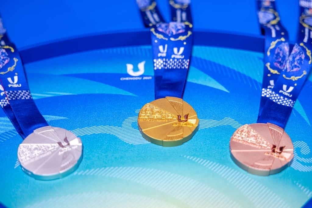 獎(jiǎng)牌是每個(gè)體育賽事的重要組成部分之一,本屆大運(yùn)會(huì)獎(jiǎng)牌根據(jù)國際大體聯(lián)要求,融合成都和國際化傳播元素,最終形成了大運(yùn)會(huì)獎(jiǎng)牌“蓉光”。獎(jiǎng)牌整體設(shè)計(jì)以成都大運(yùn)會(huì)會(huì)徽和太陽神鳥為主要靈感,利用幾何扇面代表太陽光芒,傳遞了太陽神鳥守護(hù)夢想的設(shè)計(jì)概念。獎(jiǎng)牌以“蓉光”為名,諧音為“榮光”,寓意榮耀、光彩,寄托了對(duì)大運(yùn)健兒在成都青春展翅、乘夢而行的美好期許。