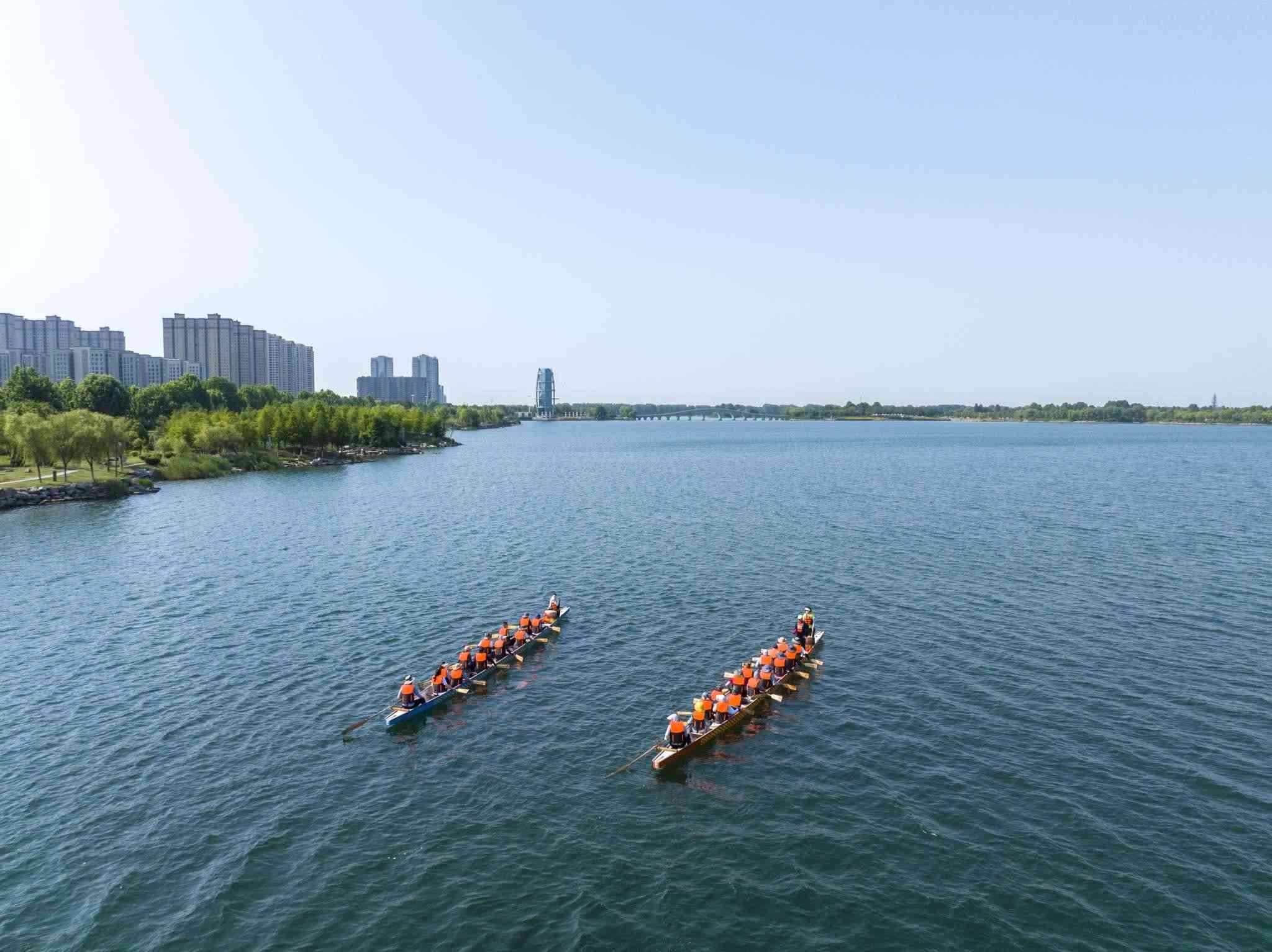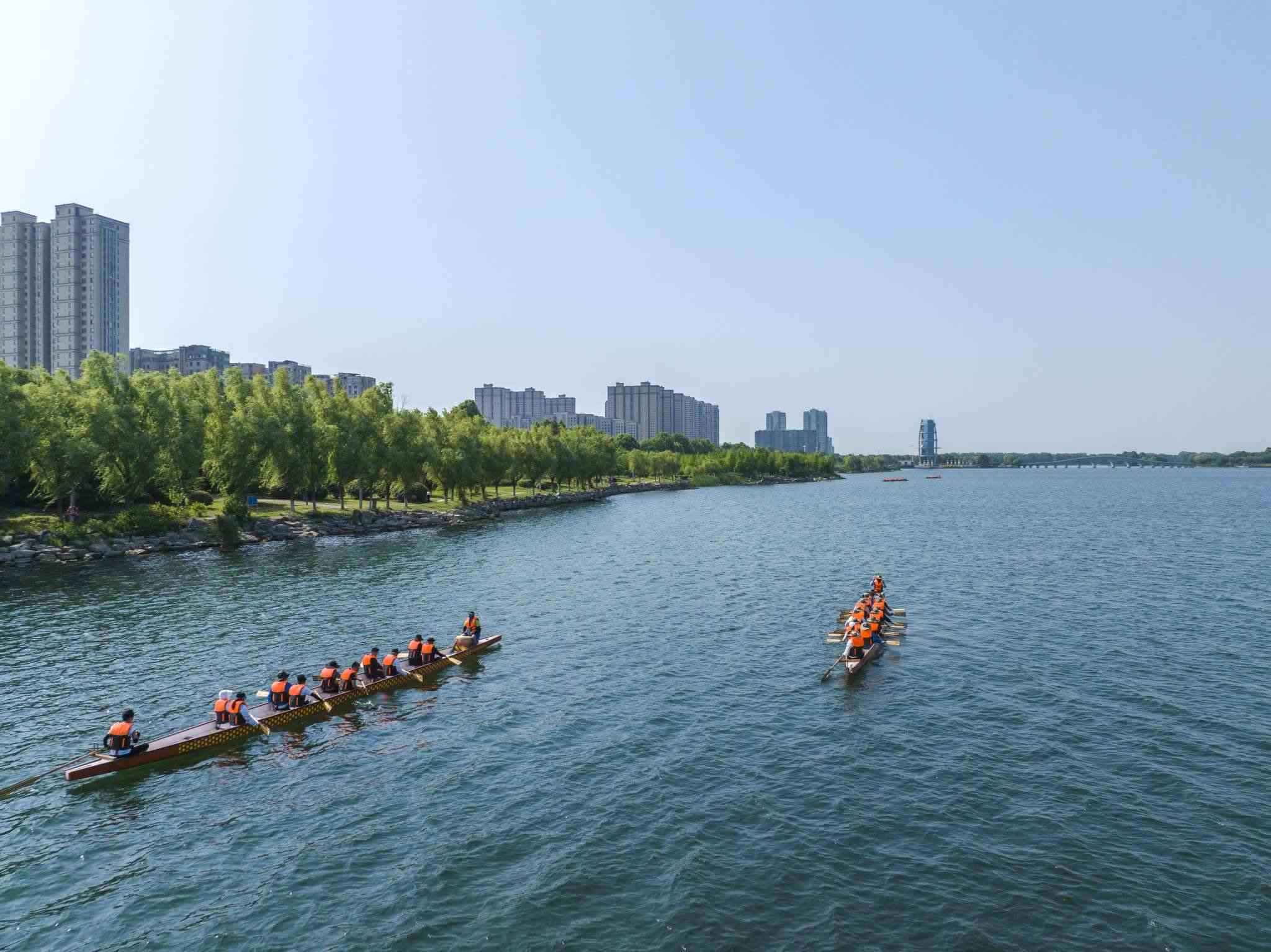 2023年6月8日,江蘇連云港,東??h西雙湖風(fēng)景區(qū),多支龍舟隊(duì)在西雙湖水域進(jìn)行訓(xùn)練,積極備戰(zhàn)端午龍舟賽。視覺中國