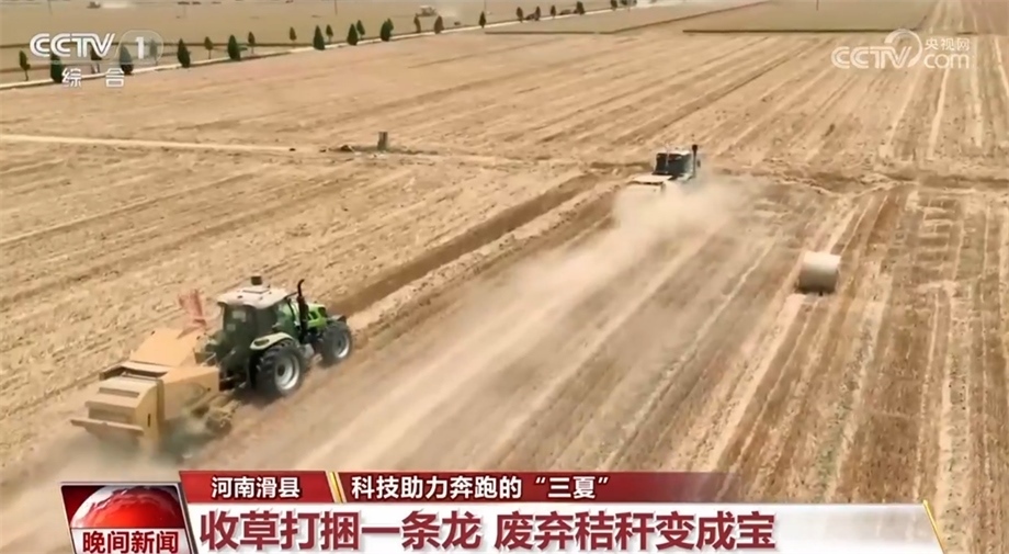 在河南滑縣上官鎮(zhèn)的麥田里,多種農(nóng)機正在聯(lián)合作業(yè)。在收割機后面緊跟著的是摟草機和秸稈打捆機,摟草機將散落的秸稈摟成行,打捆機緊跟著吸附秸稈、收草打捆。運輸車輛將碼好的秸稈拉往養(yǎng)殖場、發(fā)電廠進行綜合利用。