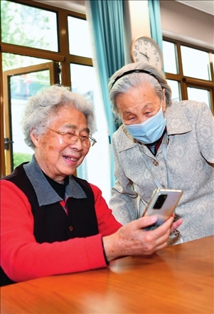 老人在位于河北三河的燕達(dá)金色年華健康養(yǎng)護(hù)中心老年活動(dòng)室交談(2022年5月18日攝)。朱旭東攝/本刊