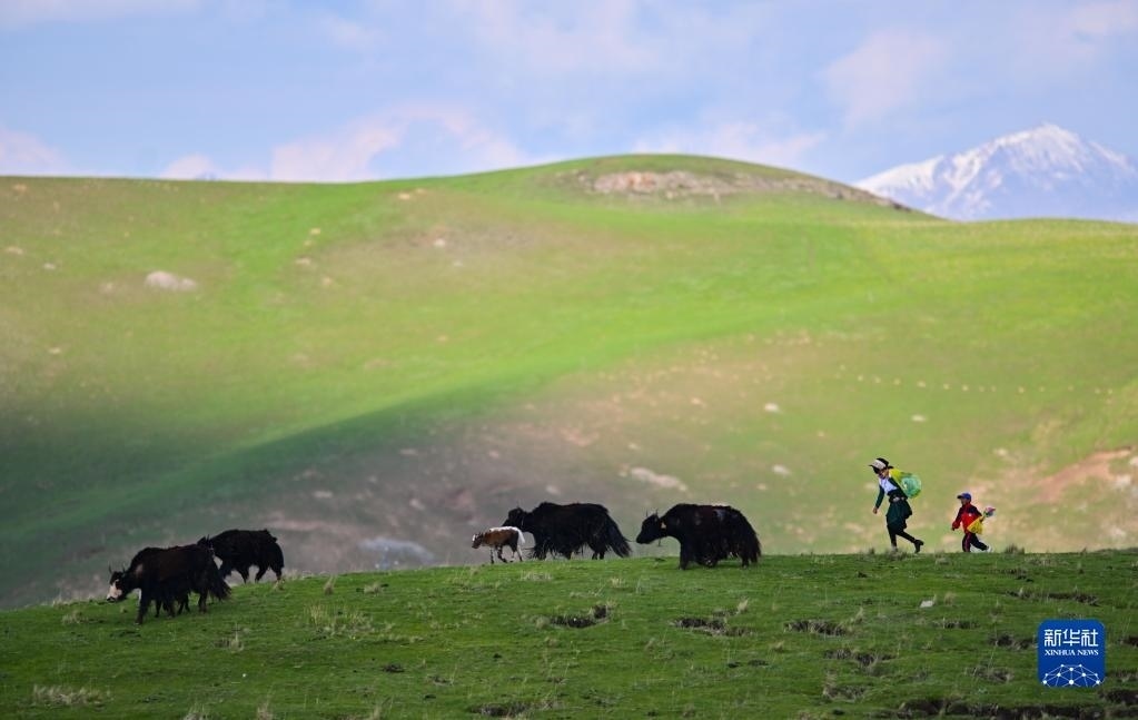 6月9日,在青海省黃南藏族自治州澤庫縣的高原草原上,當(dāng)?shù)啬撩裨诜拍痢?