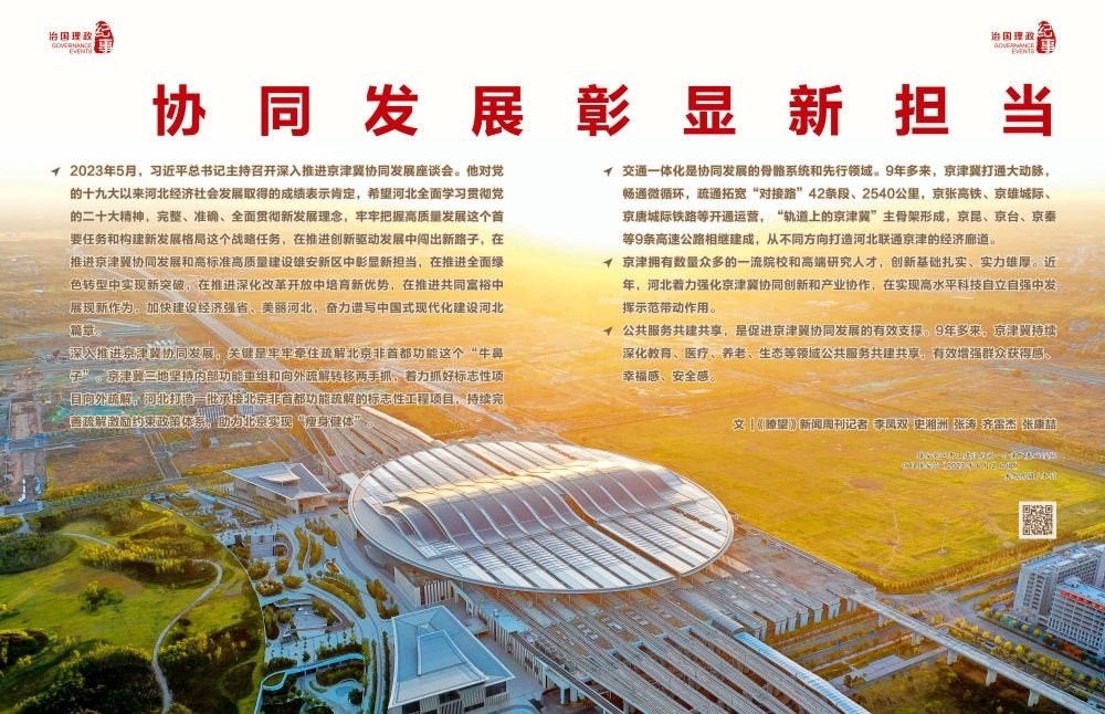 ◇2023年5月,習近平總書記主持召開深入推進京津冀協(xié)同發(fā)展座談會。他對黨的十九大以來河北經濟社會發(fā)展取得的成績表示肯定,希望河北全面學習貫徹黨的二十大精神,完整、準確、全面貫徹新發(fā)展理念,牢牢把握高質量發(fā)展這個首要任務和構建新發(fā)展格局這個戰(zhàn)略任務,在推進創(chuàng)新驅動發(fā)展中闖出新路子,在推進京津冀協(xié)同發(fā)展和高標準高質量建設雄安新區(qū)中彰顯新?lián)?,在推進全面綠色轉型中實現(xiàn)新突破,在推進深化改革開放中培育新優(yōu)勢,在推進共同富裕中展現(xiàn)新作為,加快建設經濟強省、美麗河北,奮力譜寫中國式現(xiàn)代化建設河北篇章。