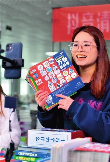 廊坊市永清經濟開發(fā)區(qū)京聯(lián)集團館配圖書聯(lián)合現(xiàn)采基地,工作人員在電商平臺直播銷售圖書(2023 年 3 月 26 日攝) 駱學峰攝 / 本刊