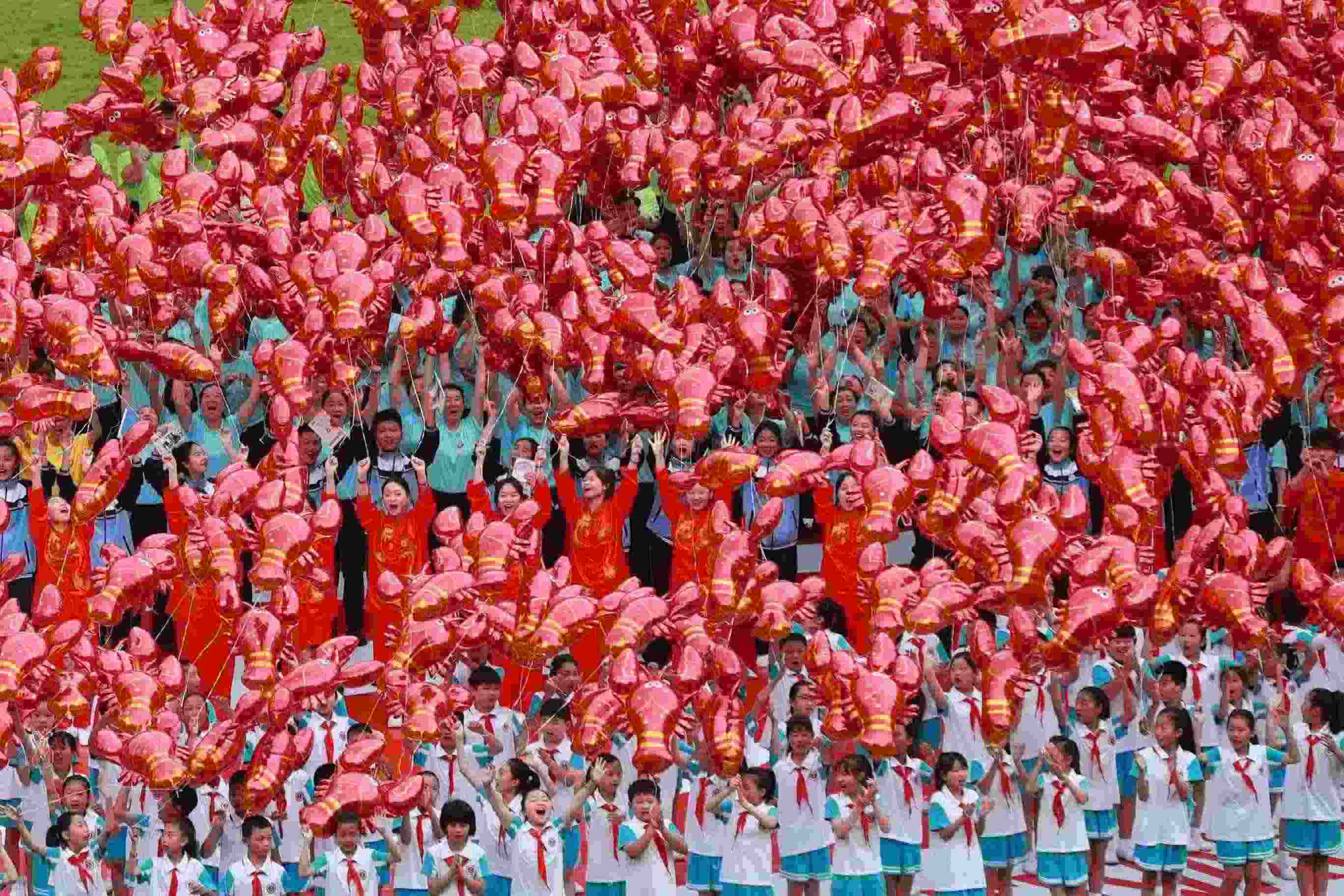 2023年6月12日,江蘇淮安,第二十三屆中國(guó)·盱眙國(guó)際龍蝦節(jié)開幕式在盱眙舉行。參加演出的演員放飛“龍蝦”氣球。 視覺中國(guó)