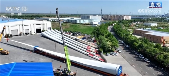 總臺央視記者 古峻嶺:我現(xiàn)在就在連云港生產(chǎn)超長風電葉片的這個廠區(qū)。我身后就是這場直播連線的主角——長達123米的超長海上風電葉片,像這樣的葉片一共有3支,我們可以看到此刻它已經(jīng)完成了正式安裝前的所有檢測工作,剛剛吊裝到一輛65米長的專用平板運輸車上,即將開啟陸地轉(zhuǎn)運的第一步。