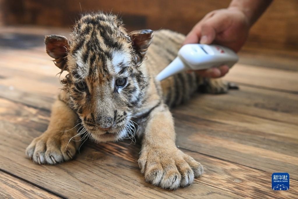 6月13日,在黑龍江東北虎林園的虎舍中,飼養(yǎng)員給東北虎幼崽測量體溫。