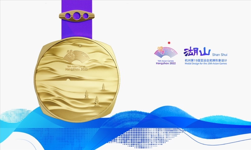 獎(jiǎng)牌取名為“湖山”,它的設(shè)計(jì)靈感源自五千年良渚文明,展示中國(guó)江南文化,呈現(xiàn)杭州山水景觀。在亞運(yùn)會(huì)獎(jiǎng)牌設(shè)計(jì)中首次將方形玉琮和圓形獎(jiǎng)?wù)氯跒橐惑w,其中獎(jiǎng)牌正面用凸出的線(xiàn)條勾勒出“三面云山一面城”的杭城畫(huà)卷,湖水漣漪,山巒起伏;獎(jiǎng)牌背面,形似方形印章,寓意運(yùn)動(dòng)員們?cè)诤贾輥嗊\(yùn)會(huì)上留下美好的印記。