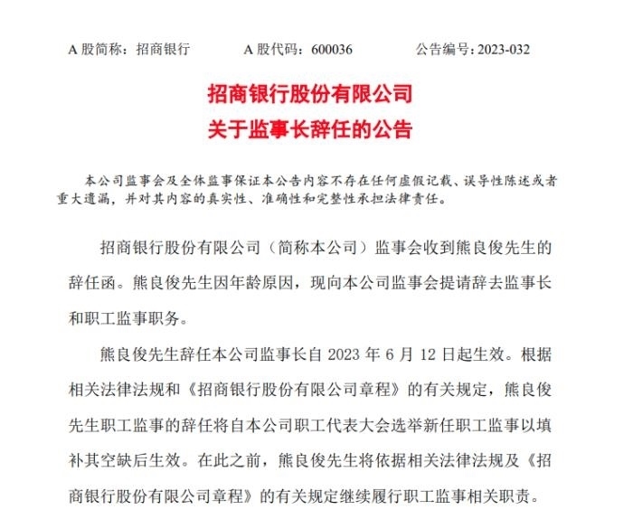 同在13日,招商銀行發(fā)布公告,該行監(jiān)事長熊良俊因年齡原因辭任。招商銀行表示,熊良俊自2021年8月起擔(dān)任招商銀行監(jiān)事長。