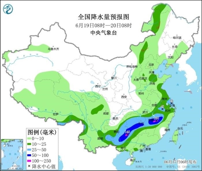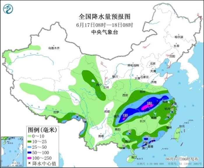 17日至19日,西南地區(qū)東部、江漢、江淮、江南、華南等地有大范圍較強(qiáng)降雨過程,部分地區(qū)有大到暴雨,局地大暴雨,并伴有短時(shí)強(qiáng)降水、雷暴大風(fēng)等強(qiáng)對(duì)流天氣。其中,6月17日08時(shí)至18日08時(shí),江淮大部、江漢大部、湖南北部、重慶中東部、貴州北部、廣西北部和南部沿海、廣東中南部、福建南部以及西藏東南部、云南西北部等地部分地區(qū)有大到暴雨,其中,湖北東部、重慶東南部、貴州東北部、廣東中南部等地部分地區(qū)有大暴雨(100~150毫米)。上述部分地區(qū)伴有短時(shí)強(qiáng)降水(最大小時(shí)降雨量20~60毫米,局地可超過70毫米),局地有雷暴大風(fēng)等強(qiáng)對(duì)流天氣。中央氣象臺(tái)6月17日06時(shí)繼續(xù)發(fā)布暴雨藍(lán)色預(yù)警。