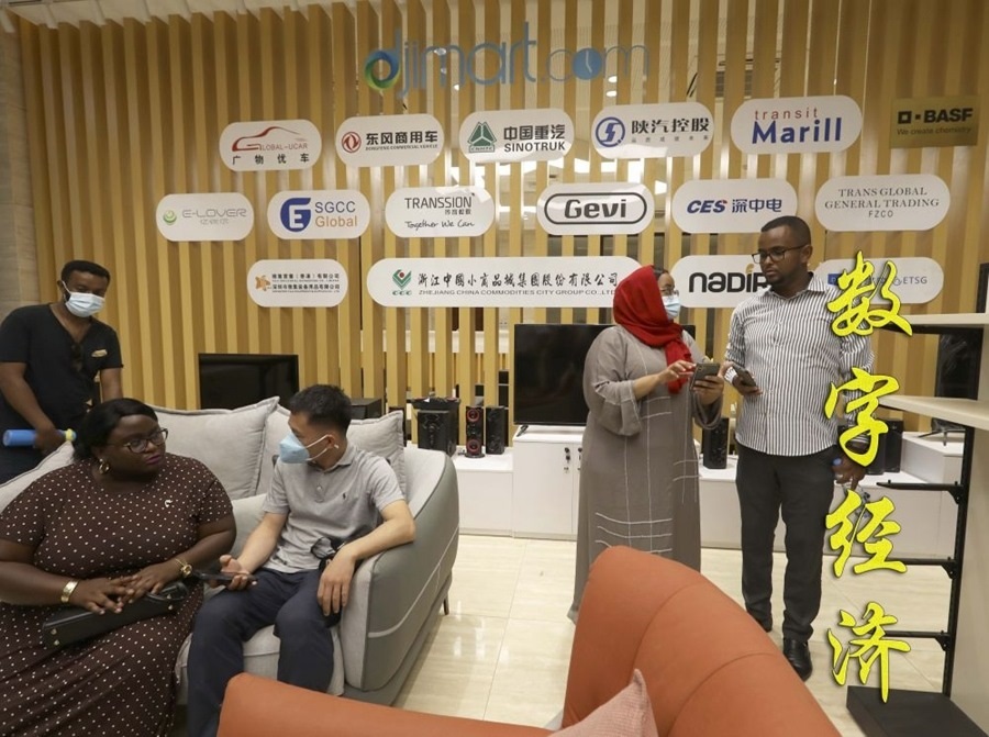 烏干達青年企業(yè)家迪莉婭(前左)在吉布提國際自貿(mào)區(qū)跨境電商平臺展示區(qū)與中方人員交流(2022年9月14日攝)。