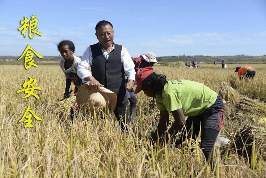 在馬達加斯加首都塔那那利佛附近的馬義奇鎮(zhèn),中國雜交水稻技術(shù)專家胡月舫(左二)在中國國家雜交水稻工程技術(shù)研究中心非洲分中心的試驗田里和當?shù)剞r(nóng)民交流(2023年5月12日攝)。目前,中國雜交水稻在馬達加斯加累計推廣面積已達5萬多公頃,平均每公頃產(chǎn)量可達7.5噸左右。馬達加斯加距離實現(xiàn)糧食自給自足的目標邁近了一大步。