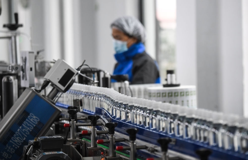 在浙江淳安經(jīng)濟(jì)開(kāi)發(fā)區(qū)一家水飲料企業(yè)拍攝的瓶裝水生產(chǎn)線(2020年12月8日攝)。新華社記者 徐昱 攝