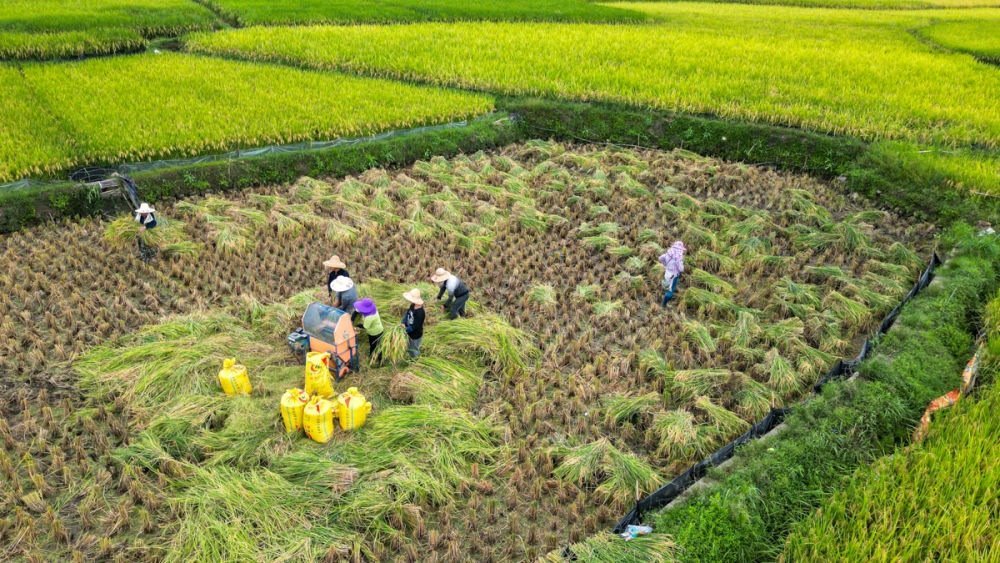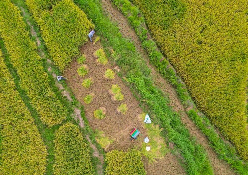 ↑2023年9月4日,湖南省東安縣舜皇山國家森林公園管理局塘家梯田,農民在收割稻谷。CICPHOTO/嚴潔 攝