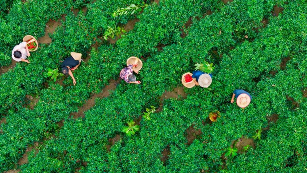 ↑2023年8月28日,河南省商丘市寧陵縣黃崗鎮(zhèn)商會南魏果蔬種植專業(yè)合作社,農民在采摘辣椒。CICPHOTO/徐碩 攝