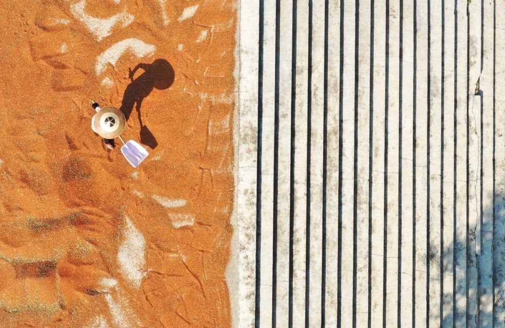 ↑2023年9月6日,湖南省張家界市武陵源區(qū)協(xié)合鄉(xiāng),農民在晾曬稻谷。CICPHOTO/吳勇兵 攝