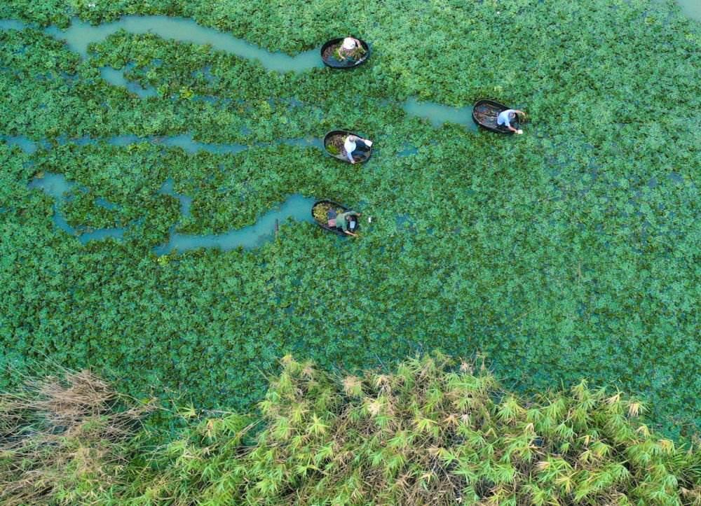 ↑2023年8月24日,浙江省湖州市長興縣夾浦鎮(zhèn)陶家灣村,菱農在采收菱角。CICPHOTO/陳海偉 攝