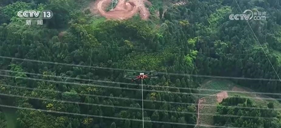 在施工現(xiàn)場,工作人員操作無人機(jī),帶著牽引繩緩緩升空,在140米的高空,帶動(dòng)重量達(dá)到6噸的導(dǎo)線,緩緩跨過500千伏嘉林線上空,最終架設(shè)在兩基170多米高、間距400米的鐵塔間。