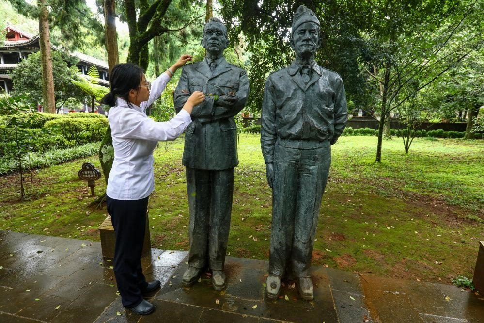 8月31日,在云南騰沖市國(guó)殤墓園內(nèi),工作人員為史迪威將軍雕像(左為史迪威、右為陳納德)清理落葉。