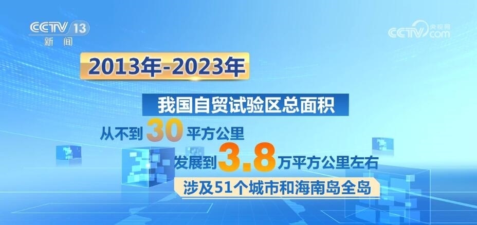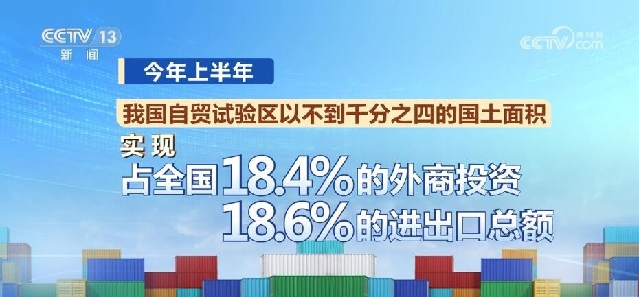 十年間,我國自貿(mào)試驗(yàn)區(qū)的總面積從不到30平方公里發(fā)展到3.8萬平方公里左右,涉及51個(gè)城市和海南島全島。今年上半年,我國自貿(mào)試驗(yàn)區(qū)以不到千分之四的國土面積,實(shí)現(xiàn)了占全國18.4%的外商投資和18.6%的進(jìn)出口總額,帶動全國形成了覆蓋東西南北中、統(tǒng)籌沿海內(nèi)陸沿邊的改革開放創(chuàng)新格局。