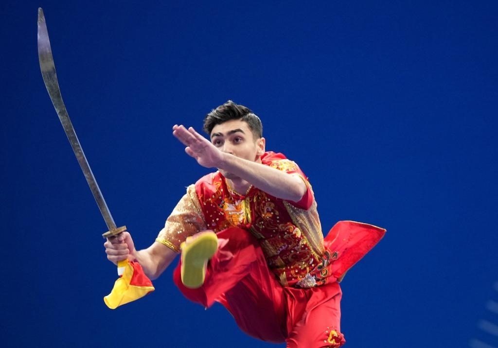 9月27日,伊朗選手侯賽因·蓋卜萊納邁·穆加達姆在刀術(shù)比賽中。當日,杭州亞運會武術(shù)男子刀術(shù)棍術(shù)全能決賽在杭州蕭山瓜瀝文化體育中心舉行。新華社記者 李一博 攝