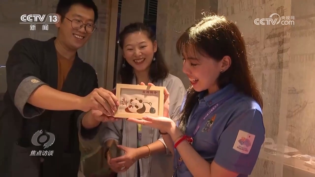 村里的文化市集里同樣熱鬧非凡,竹編、剪紙、皮影戲……每一個展位面前都圍著不少外國運動員。來自泰國的擊劍運動員正在體驗綢傘刷花。在刷子涂上顏料,再和絲網(wǎng)進行充分摩擦,顏料就會透過刻板平鋪在畫布上,精美的熊貓圖案就做出來了。當(dāng)?shù)弥@是綢傘上的技術(shù)時,運動員班提達十分驚訝。
