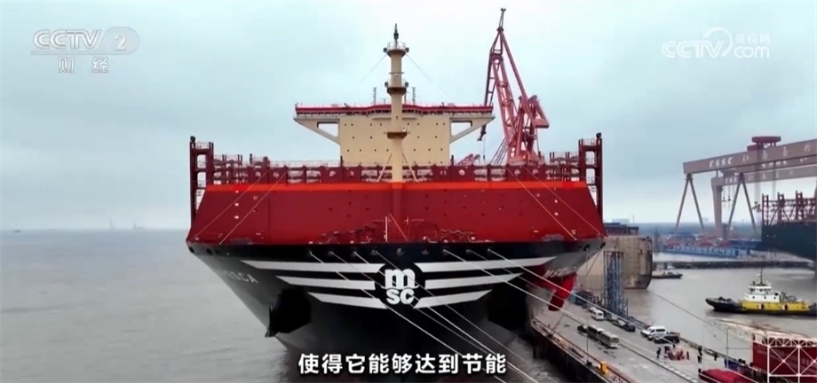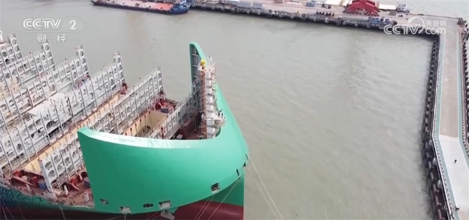 總臺央視記者 孟湛東:我現(xiàn)在是在中國船舶滬東中華造船廠的一艘13000箱的雙燃料集裝箱船上。這艘船除了使用傳統(tǒng)的石油燃料之外,還引入了液化天然氣,可以直接降低28%以上的溫室氣體排放。除此之外,在船頭還有一個獨特的設(shè)計,各位可以看到一個綠色的防風罩,工人們親切地稱它“綠頭怪”,這樣的設(shè)計可以讓船舶在正常行駛當中降低2%左右的燃料消耗。