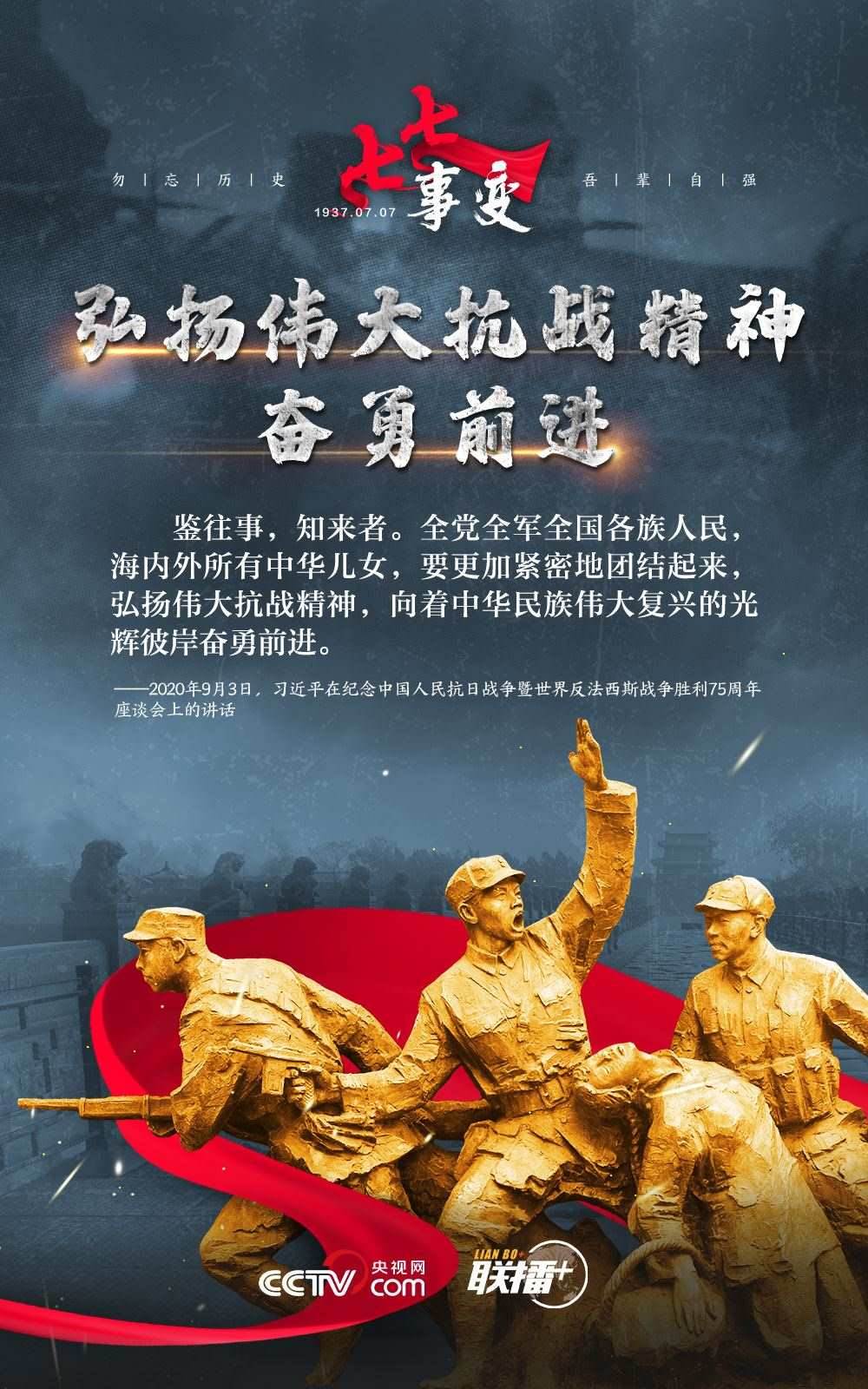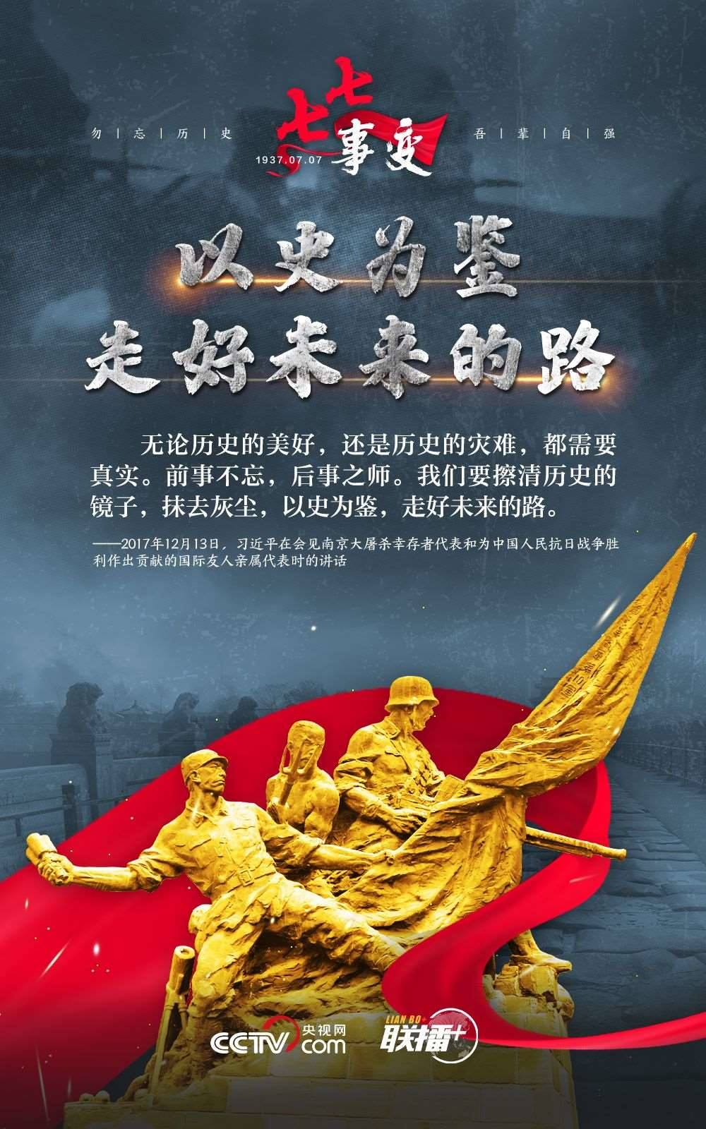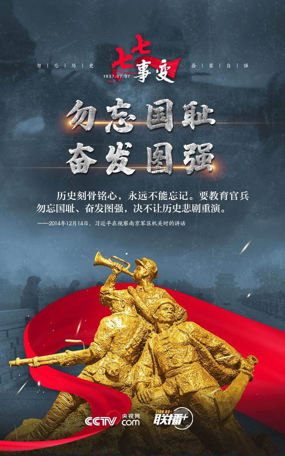 悼念同胞,緬懷先烈。勿忘歷史,吾輩自強(qiáng)!在“七七事變”86周年之際,央視網(wǎng)《聯(lián)播+》欄目特推出海報(bào),與您一起從總書記講話中汲取自強(qiáng)不息的奮進(jìn)力量。