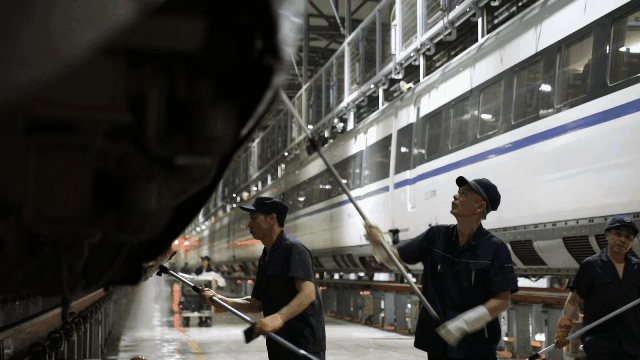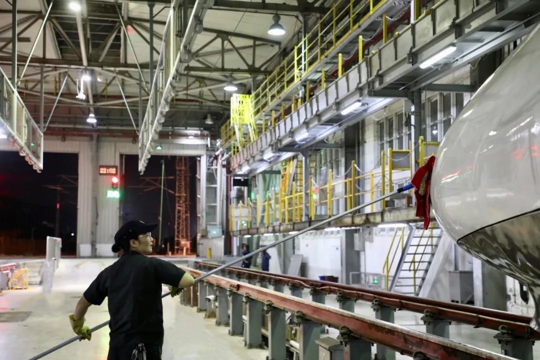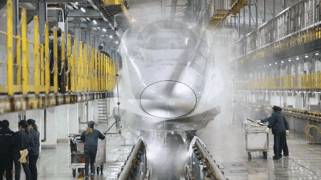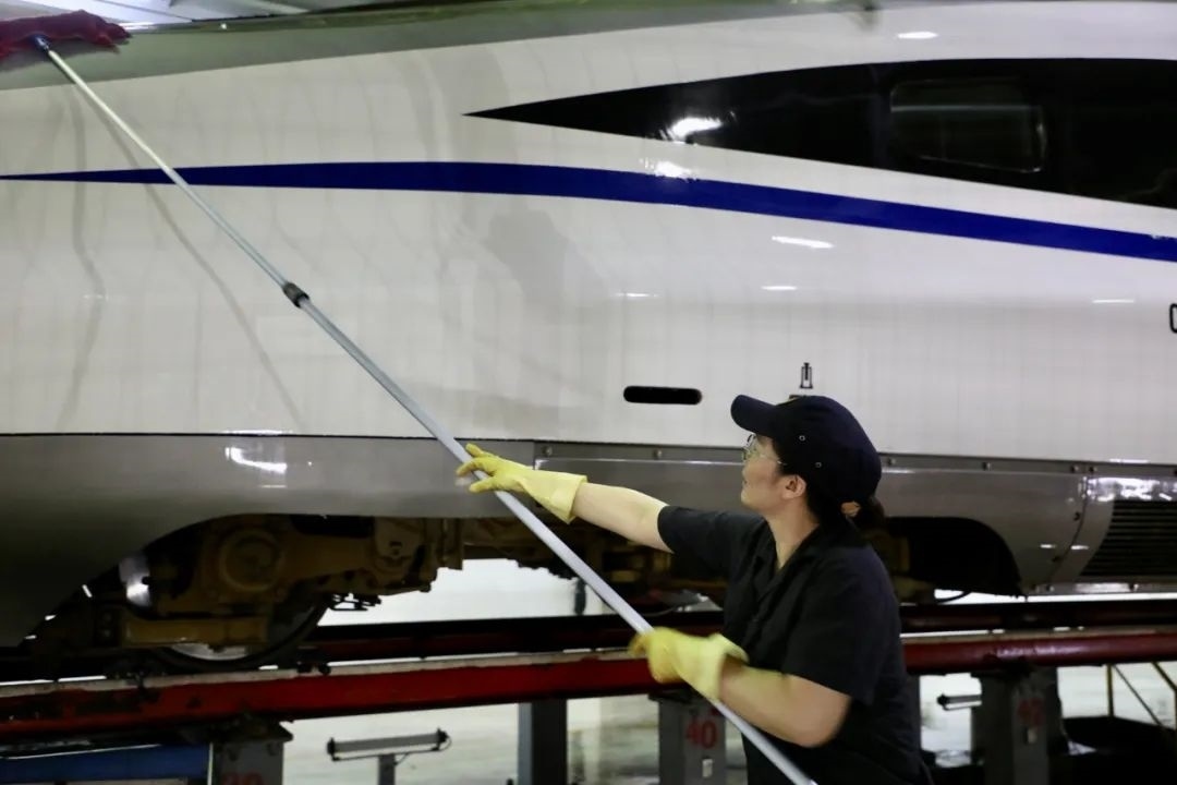 經(jīng)過自動(dòng)清洗的動(dòng)車組在開進(jìn)動(dòng)車所檢修庫(kù)后,將由洗車人員進(jìn)行深度清潔。20多名洗車人員分工協(xié)作對(duì)動(dòng)車組車頂、車身等各部位進(jìn)行清洗。