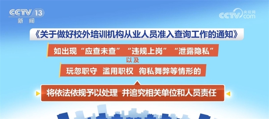 此外,《通知》強調(diào)嚴明查詢管理責任。各級教育部門和相關(guān)主管部門、校外培訓機構(gòu)及其工作人員應(yīng)履行準入查詢的法定職責,如出現(xiàn)“應(yīng)查未查”“違規(guī)上崗”“泄露隱私”以及玩忽職守、濫用職權(quán)、徇私舞弊等情形的,將依法依規(guī)予以處理,并追究相關(guān)單位和人員責任。