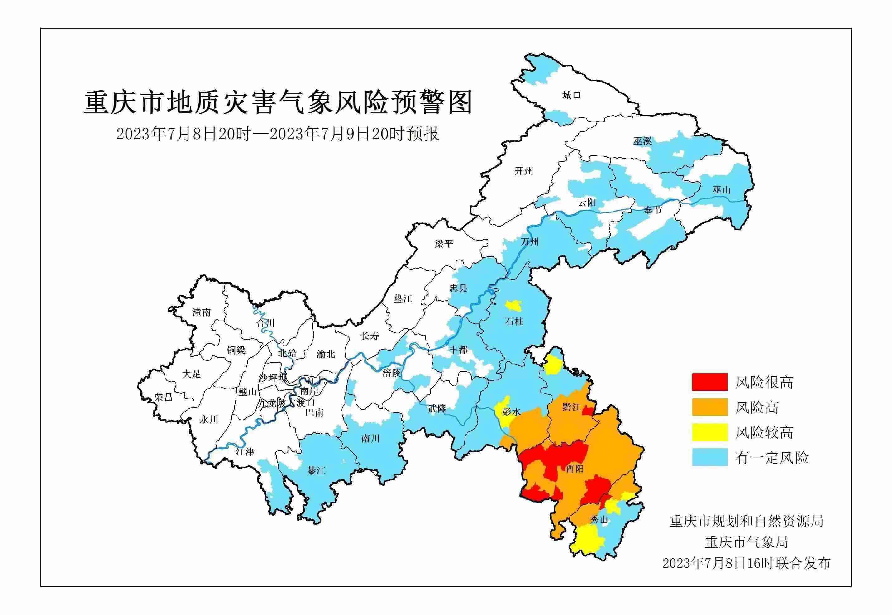 7月8日20時至7月9日20時,酉陽縣、秀山縣、黔江區(qū)屬于風(fēng)險很高地區(qū),地質(zhì)災(zāi)害氣象風(fēng)險等級為I級(紅色預(yù)警),彭水縣屬于風(fēng)險高地區(qū),地質(zhì)災(zāi)害氣象風(fēng)險等級為Ⅱ級(橙色預(yù)警),石柱縣屬于風(fēng)險較高地區(qū),地質(zhì)災(zāi)害氣象風(fēng)險等級為Ⅲ級(黃色預(yù)警),城口縣、萬州區(qū)、云陽縣、巫山縣、巫溪縣、奉節(jié)縣、忠縣、涪陵區(qū)、豐都縣、江津區(qū)、綦江區(qū)、萬盛經(jīng)開區(qū)、南川區(qū)、武隆區(qū)、巴南區(qū)屬于有一定風(fēng)險地區(qū),地質(zhì)災(zāi)害氣象風(fēng)險等級為Ⅳ級(藍色預(yù)警)。