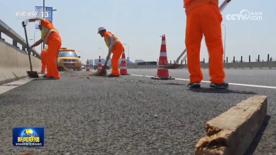 這兩天,北京持續(xù)高溫。在廣渠快速路上,道路養(yǎng)護(hù)工人正頂著烈日清理過(guò)往車輛遺撒的沙石。由于地面溫度高,這些沙石極容易引起車輛爆胎。
