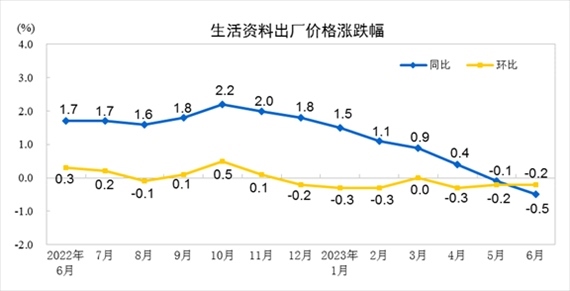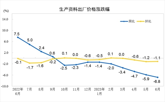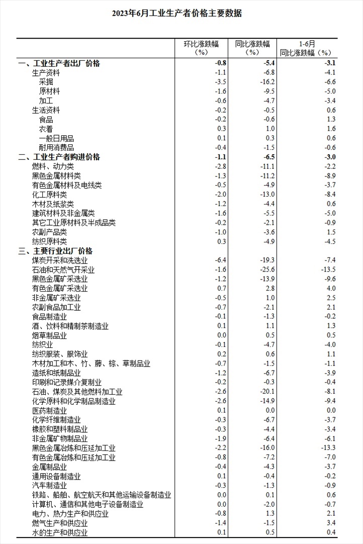 央視網(wǎng)消息:據(jù)國家統(tǒng)計局網(wǎng)站消息,2023年6月份,全國工業(yè)生產(chǎn)者出廠價格同比下降5.4%,環(huán)比下降0.8%;工業(yè)生產(chǎn)者購進價格同比下降6.5%,環(huán)比下降1.1%。上半年,工業(yè)生產(chǎn)者出廠價格比上年同期下降3.1%,工業(yè)生產(chǎn)者購進價格下降3.0%。