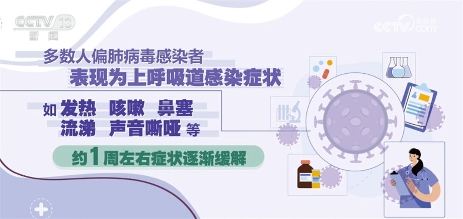 《人偏肺病毒感染診療方案(2023年版)》指出,人偏肺病毒感染者是主要傳染源。從潛伏期末到急性期都有傳染性。主要通過(guò)飛沫和密切接觸傳播,也可以通過(guò)接觸被病毒污染的物品間接傳播。人偏肺病毒人群普遍易感,在5歲以下兒童、老年人和免疫功能低下的人群中更為多見,潛伏期為3天—9天,多為3天—6天。多數(shù)人偏肺病毒感染者表現(xiàn)為上呼吸道感染癥狀,如發(fā)熱、咳嗽、鼻塞、流涕、聲音嘶啞等,約1周左右癥狀逐漸緩解。鑒于目前尚無(wú)證據(jù)證明有對(duì)人偏肺病毒有效的特異性抗病毒藥物,不建議使用抗病毒藥物進(jìn)行治療。避免盲目或不恰當(dāng)使用抗菌藥物,尤其是聯(lián)合使用廣譜抗菌藥物。