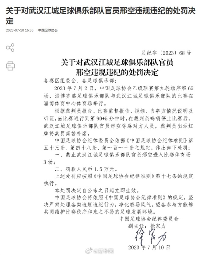 ·中國足協(xié)再開罰單,兩名俱樂部官員因違規(guī)違紀(jì)被罰。