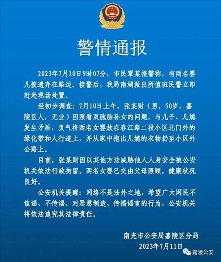·網(wǎng)傳“老人當(dāng)街遺棄雙胞胎女嬰”,警方:系負(fù)氣而為,已行拘。