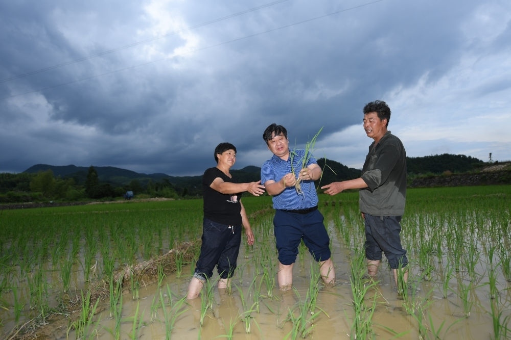 在浙江省仙居縣廣度鄉(xiāng)西角村,浙江大學環(huán)境與資源學院教授吳良歡(中)在省級科研試驗田里指導農戶進行水稻種植(7月4日攝)。新華社記者 翁忻旸 攝