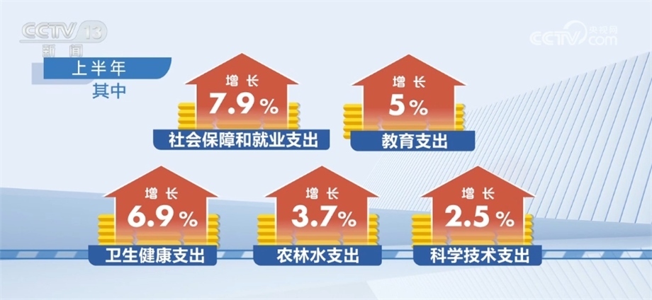 從支出看,上半年,全國一般公共預(yù)算支出133893億元,同比增長3.9%。其中,社會保障和就業(yè)支出增長7.9%,教育支出增長5%,衛(wèi)生健康支出增長6.9%,農(nóng)林水支出增長3.7%,科學(xué)技術(shù)支出增長2.5%,基本民生、鄉(xiāng)村振興、區(qū)域重大戰(zhàn)略、教育、科技攻關(guān)等重點支出得到有力保障。