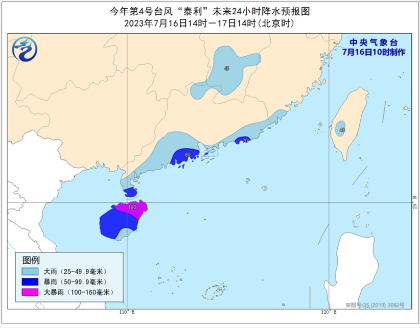 降水預(yù)報:7月16日14時至17日14時,廣東南部和北部、海南島、福建東南部、江西中部和南部、臺灣島南部等地的部分地區(qū)有中到大雨,其中海南島、雷州半島南部、廣東南部沿海等地局地有暴雨或大暴雨(100-160毫米)。